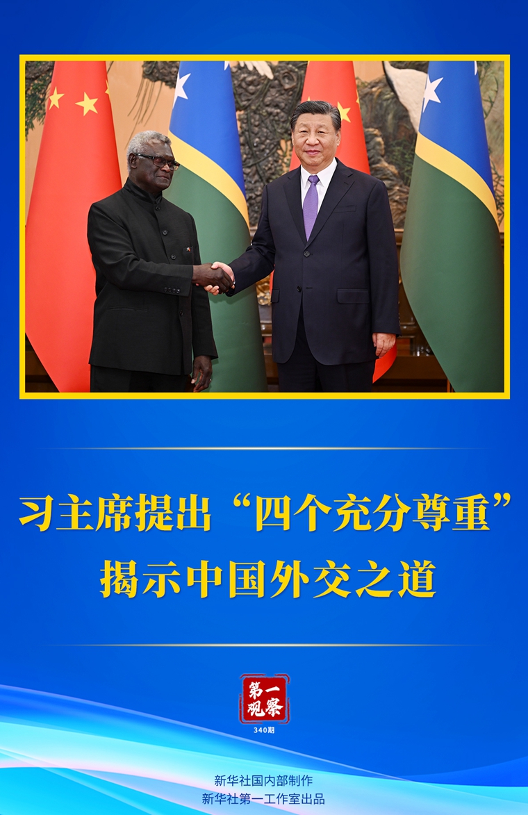 7月10日下午,国家主席习近平在人民大会堂会见来华进行正式访问的所罗门群岛总理索加瓦雷。会见中,习近平主席指出,中国的太平洋岛国政策秉持“四个充分尊重”——