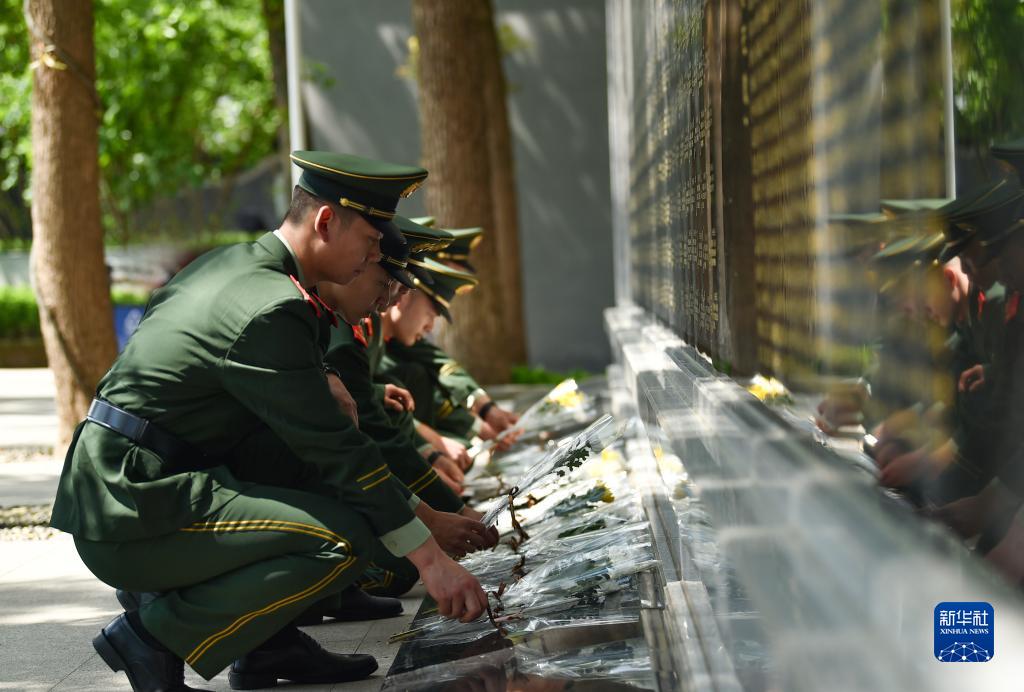 武警重庆总队执勤第一支队在邱少云烈士纪念馆开展祭扫活动,官兵向革命英烈敬献鲜花(2023年4月5日摄)。新华社发(郭传伍 摄)