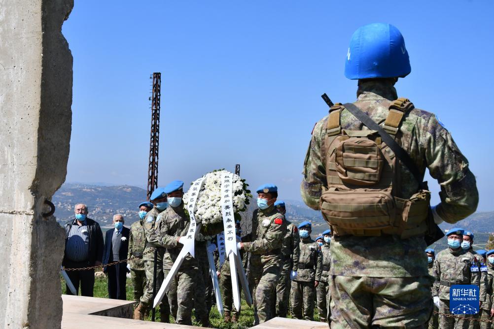 中国维和官兵在黎巴嫩南部希亚姆镇向烈士纪念碑敬献花圈(2021年4月4日摄)。新华社发(丁文栋 摄)