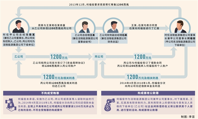 高梓航:经分析研讨,我们认为何福俊上述行为构成挪用公款罪。本案中,乙公司系国有公司涪陵能源集团公司下级单位,其经营性收益由涪陵能源集团公司持有管理。为更好经营、管理乙公司,涪陵能源集团公司委派该公司董事会秘书王某兼任乙公司总经理、公司财务总监石某兼任乙公司财务副总经理。2013年12月,何福俊为筹集入股甲公司的资金,安排时任甲公司总经理、乙公司董事长兼丙公司实际控制人周某从乙公司拆借资金1200万元给丙公司,再由丙公司将该1200万元转借给自己,归其个人使用,进行营利活动,周某按照何福俊的安排拆借乙公司资金,并以丙公司名义借款1200万元给何福俊是基于何福俊作为涪陵能源集团公司兼甲公司董事长的职权对周某所实际产生的制约力,实际上是何福俊利用职务上的便利,挪用了乙公司公款1200万元,何福俊的行为侵犯了乙公司对公款的占有、使用、收益权,同时也侵犯了国家的财经管理制度和国家工作人员的职务廉洁性。何福俊具有挪用公款罪的主观故意,根据主客观相一致原则,应认定其构成挪用公款罪。
