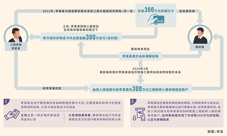 2012年春节前,老板李某某为感谢蔡前锋在承揽工程方面提供的帮助,将一张存有300万元的银行卡及密码送给蔡前锋。之后,李某某听说该行贿方式风险较大,因担心被查处,在未告知蔡前锋的情况下,将卡挂失并取走卡内全部金额300万余元(含利息)。蔡前锋发现后,李某某表示会对其补偿。2016年2月,蔡前锋利用其对李某某承揽的铁路工程项目具有审批监管等职权制约关系,经李某某同意,由他人将应拨付给李某某的300万元工程款转入蔡前锋指定账户用于归还其个人债务。