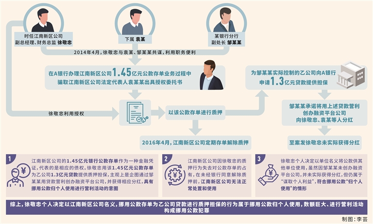 挪用公款罪。2014年4月,时任江南新区公司副总经理、财务总监的徐敬忠与下属袁某、某银行分行副处长邹某某(均另案处理)共谋,利用职务便利,在a银行办理江南新区公司1.45亿元公款定期存单业务过程中,以办理定期存单需时任江南新区公司法定代表人袁某某授权委托为由,骗取袁某某出具授权委托书后,擅自以该1.45亿元公款存单为邹某某实际控制的乙公司提供质押担保,使乙公司在a银行获得1.3亿元贷款并用于营利活动,邹某某承诺用营利创办融资平台公司,并给予徐敬忠相应分红,但徐敬忠未实际获得。2016年4月,江南新区公司1.45亿元公款存单解除质押。