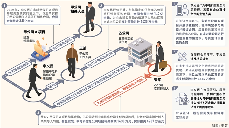 史小帅:签订、履行合同失职被骗罪中的“严重不负责任”在实践中主要表现为以下几种情形:一是盲目轻信,不认真审查对方当事人的合同主体资格、资信情况;二是不认真审查对方的履约能力和货源情况;三是违背客观经济规律,盲目决策签订或者履行经济合同;四是在被骗后因担心被问责未采取有效补救措施致使国家利益受损,等等。本案中,李义民作为中电科信息公司总经理,系国有企业直接负责的主管人员。在签订合同环节,李义民违反公司相关规定,未对甲公司a项目开展调查核实,轻率决定参与该项目并签订合同,后又轻信王某所指定的供货商乙公司,在未按照相关规定对乙公司进行资信调查的情况下,与该公司签订设备采购合同,合同金额共计1.4亿余元。在履行合同环节,李义民违反公司相关规定,在未安排人员到交货地点现场验收货物、未确认存在真实货物流转的情况下,向乙公司以承兑汇票的方式支付货款共计6425万余元。经查,甲公司a项目纯属虚构,乙公司收到中电科信息公司支付的货款后,被该公司实际控制人柴某等人转出。截至案发,中电科信息公司实际损失4987万余元。综上,李义民作为中电科信息公司直接负责的主管人员,在合同签订、履行过程中的一系列严重不负责任行为,是导致该公司被他人以合同形式骗取单位财物的直接因素和主要因素,可以认定李义民上述严重失职行为与中电科信息公司损失4987万余元之间具有法律上的因果联系,构成签订、履行合同失职被骗罪。