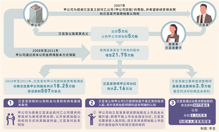 其中,2006年,甲公司控股的乙公司成立,乙公司总经理赖某请托兰显发利用职务便利在乙公司扩大农机产品市场、获取农机购置补贴等方面提供帮助。2007年,甲公司筹备上市,甲公司为感谢兰显发此前的职务行为并希望继续获得关照,向兰显发开放原始股认购权,并承诺公司上市后该原始股会有大幅增值,即使没有上市也会保证分红,兰显发表示同意。2008年2月,兰显发以其妻高某某名义出资5万元认购甲公司原始股5万股。2009年10月,甲公司上市。2008年至2011年,甲公司通过资本公积金转增股本方式增股,使得高某某名下持有的股份增至21.75万股。2010年11月至2011年5月,兰显发在原始股禁售期满后,分两次出售股份共计18.25万股,扣除股本金、手续费、税费后非法获利507万余元。兰显发被立案审查调查期间,高某某出售剩余3.5万股,截至判决时扣税后暂未获利。此外,兰显发所持股份获得甲公司分红共计2.16万元。