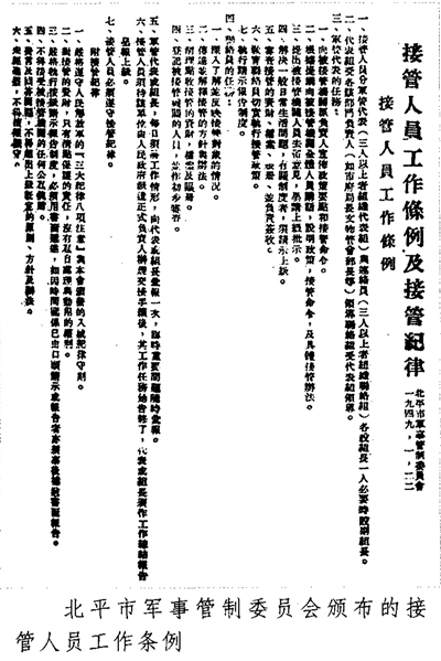 1948年12月22日,平津前线司令部发布“约法八章”。12月28日,叶剑英签发《北平市军管会关于做好入城准备工作的通告》,规定了“入城纪律十四条”,细化了“约法八章”,要求入城人员服装整齐,注意礼节,不准在街上吃东西,不准私入民宅,遵守群众纪律等。1949年1月22日,市军管会又发布《接管人员工作条例及接管纪律》,要求“严格遵守人民解放军的‘三大纪律八项注意’与本会颁发的入城纪律守则”“严格执行按级请示报告制度”“不得接受被接管机关的任何公私馈赠”等6条接管纪律。