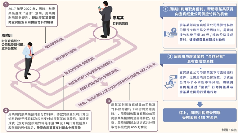 其中,2017年至2022年,周晓川在担任宜宾纸业公司党委副书记、监事会主席等职务期间,与竹料供货商廖某某达成“合作”意向,周晓川为廖某某向宜宾纸业公司供应竹料提供帮助,之后,按照1.5万元/车向廖某某预付部分竹料款,待宜宾纸业公司计算出竹料的绝干吨位以及应当支付给廖某某的货款后,扣除提成费(双方商定按照竹料绝干量30元/吨计算提成费)和前期的预付款后,垫资向廖某某支付剩余全部货款。廖某某则将宜宾纸业公司结算竹料款的银行卡和密码交给周晓川,周晓川收取宜宾纸业公司向廖某某拨付的全部结算款。经查,周晓川通过上述方式共计获取竹料提成费455万余元。