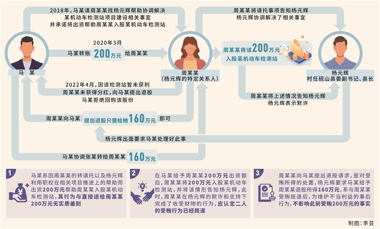 范朝勇:本案中,根据周某某供述,马某因砚山县某机动车检测站项目建设一直未能推进找到她,请她向杨元辉协调,并承诺会出资帮其入股某机动车检测站。之后,周某某收取马某200万元出资额,再将该200万元转到张某账户,完成了形式上的入股即“合作”投资。2022年,周某某向马某提出退股事宜,双方未能达成一致。杨元辉出面要求马某处理好此事,马某协调张某转账160万元给周某某。根据马某证言,其为周某某出资的200万元,实际上就是为了感谢杨元辉在某机动车检测站项目上的协调帮助而给予的好处费。之后,周某某在向其提出退股并要回该200万元时,因检测站项目尚未获利,拒绝了周某某的要求。周某某又提出只需160万元即可,马某仍在考虑如何处理,此时,杨元辉打电话要求其与周某某结清账目,基于杨元辉的职权影响,遂安排他人转账160万元给周某某。