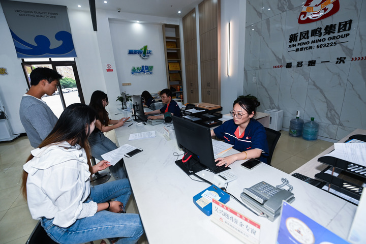 湖州市吴兴区政务办“吴兴跑团”驻企服务专员在位于吴兴区东林镇的新凤鸣集团湖州基地为企业“上门办”,为企业员工办证办事。新华社记者徐昱 摄