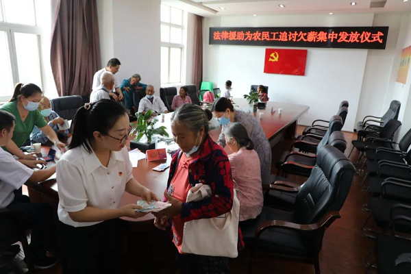 2022年9月9日,中秋佳节前夕,广元市法律援助中心、市司法局经开区分局在盘龙镇人民政府三楼会议室举行了农民工工资集中发放仪式。李某某等9名失地农民工拿到了拖欠2年的辛苦钱。