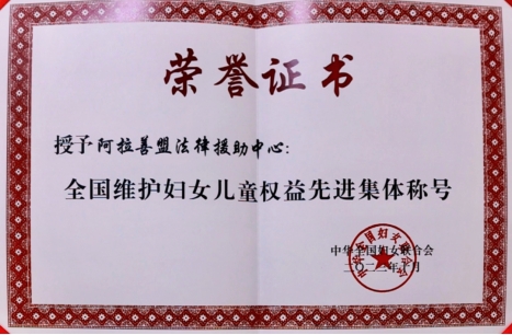 2024年“三八”国际妇女节来临之际,内蒙古阿拉善盟妇女联合会将印有“全国维护妇女儿童权益先进集体”的博天堂最新的荣誉证书送到了阿拉善盟法律援助中心。