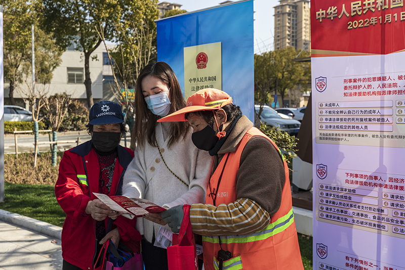 冯娜向环卫工人宣传介绍法律援助法。冒亚楠 摄