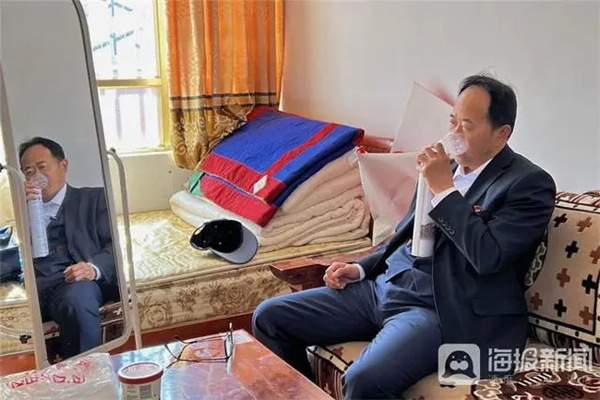 在西藏高原,经过一天的工作,张伟律师坐下来吸吸氧,这是他解决高原反应的一种方式。