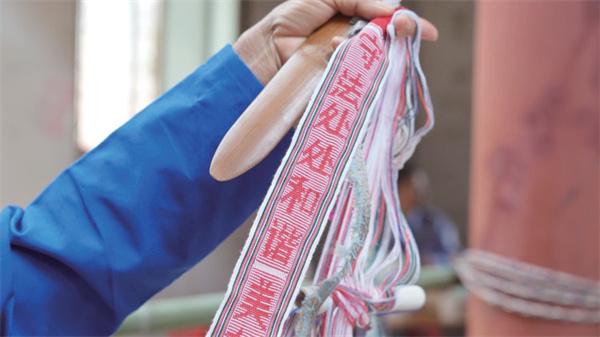 村民手工织成写有“守法处处和谐 美好人生法治同行”的普法花带