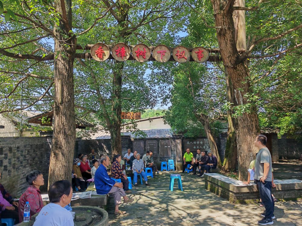 重庆市南川区木凉镇汉场坝村的村民们在香樟树下聆听普法故事。新华社记者周思宇 摄