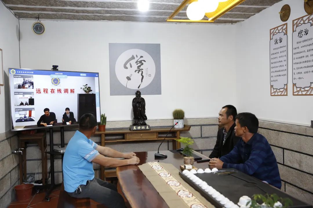 军营村“高山议理堂”中,同安区人民法院、莲花镇司法所的工作人员正在为村民远程调解矛盾解纷、普法。受访者供图