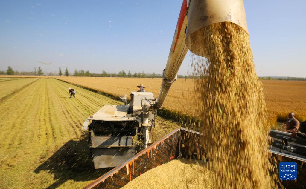 山东省临沂市郯城县郯城街道农民将收获的水稻装车(2022年10月23日摄)。新华社发(张春雷摄)