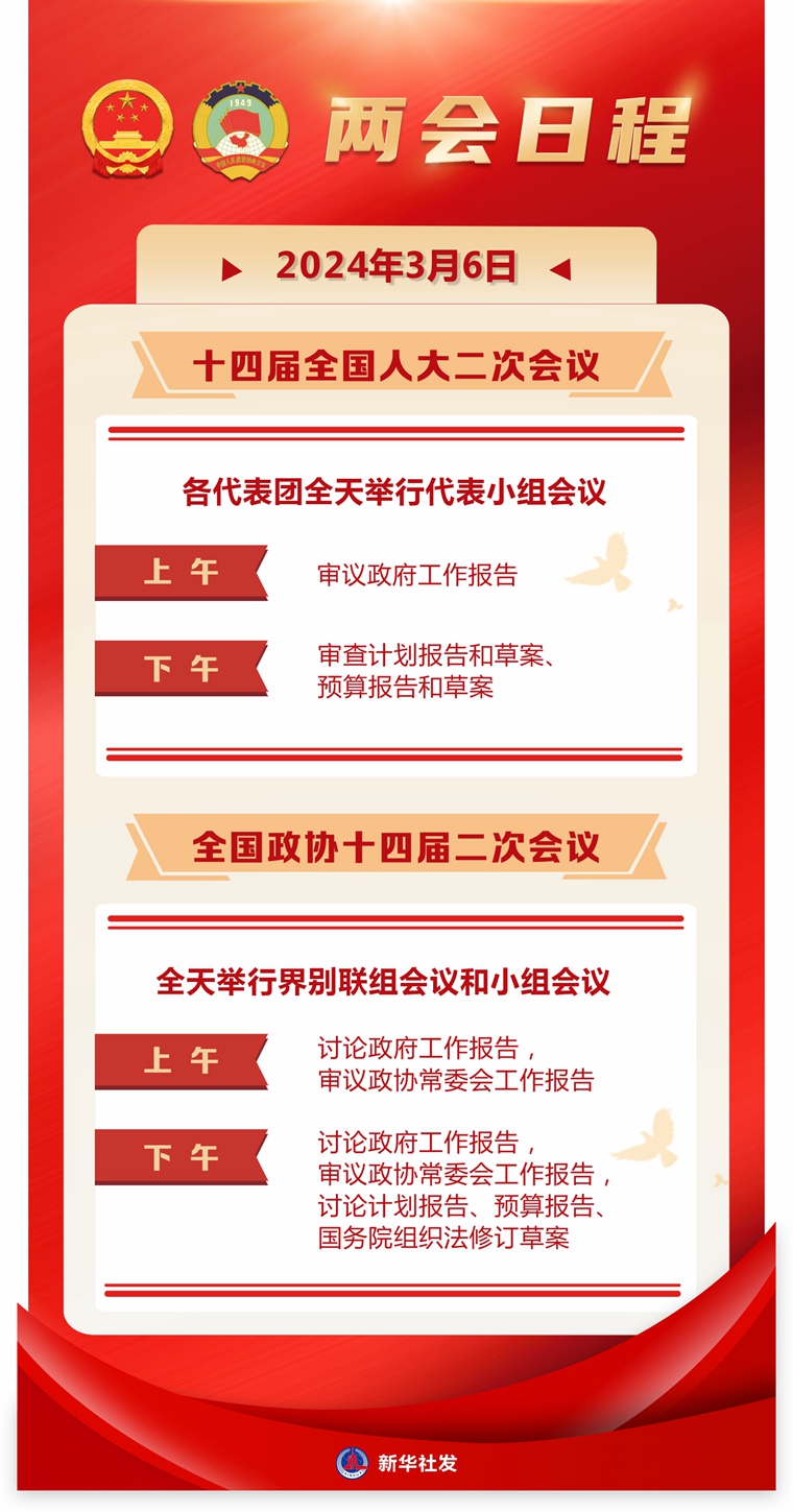 新华社北京3月5日电 十四届全国人大二次会议各代表团6日全天举行代表小组会议。上午审议政府工作报告,下午审查计划报告和草案、预算报告和草案。