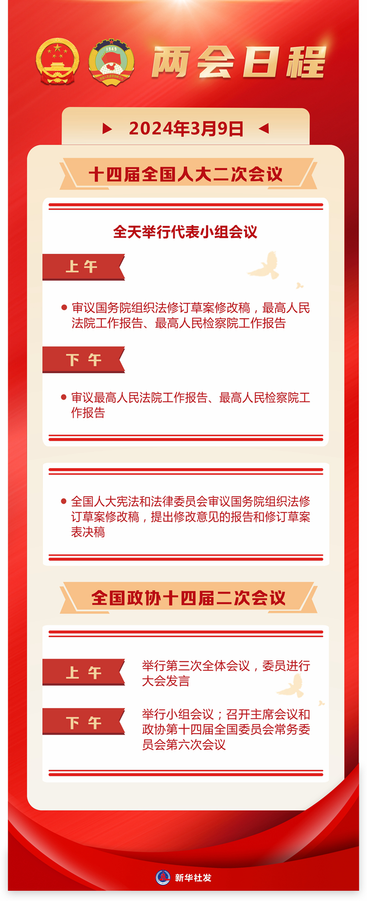 新华社北京3月8日电 十四届全国人大二次会议9日全天举行代表小组会议。上午,审议国务院组织法修订草案修改稿,最高人民法院工作报告、最高人民检察院工作报告;下午,审议最高人民法院工作报告、最高人民检察院工作报告。