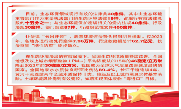 在生态环境法治的有效保障下,我国生态环境质量持续改善。全国地级及以上城市细颗粒物(pm2.5)平均浓度从2015年的46微克/立方米降到2023年的30微克/立方米,我国成为全球大气质量改善速度最快的国家。全国地表水水质优良断面比例达89.4%,长江干流连续4年、黄河干流连续两年全线水质保持ⅱ类,地级及以上城市黑臭水体基本消除。土壤环境风险得到有效管控,如期实现固体废物“零进口”目标。