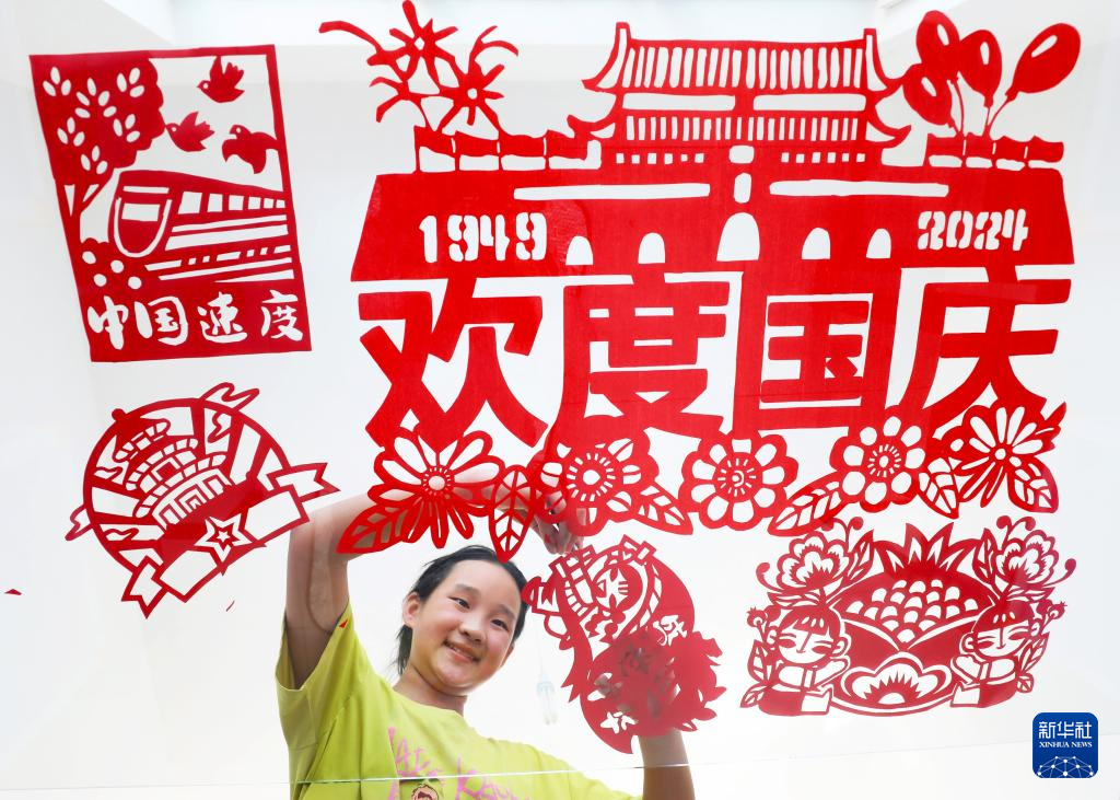 9月25日,在河北省唐山市丰润区左家坞镇银子山小学,学生在创作以“迎国庆”为主题的剪纸作品。