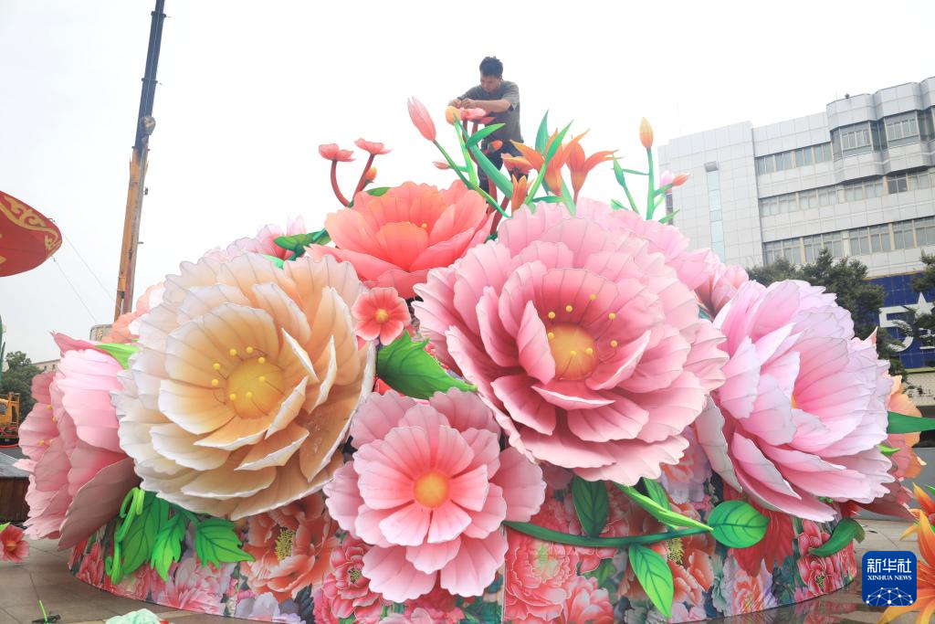 9月25日,在浙江省舟山市定海区文化广场,工人在组装“祝福祖国”主题彩灯。