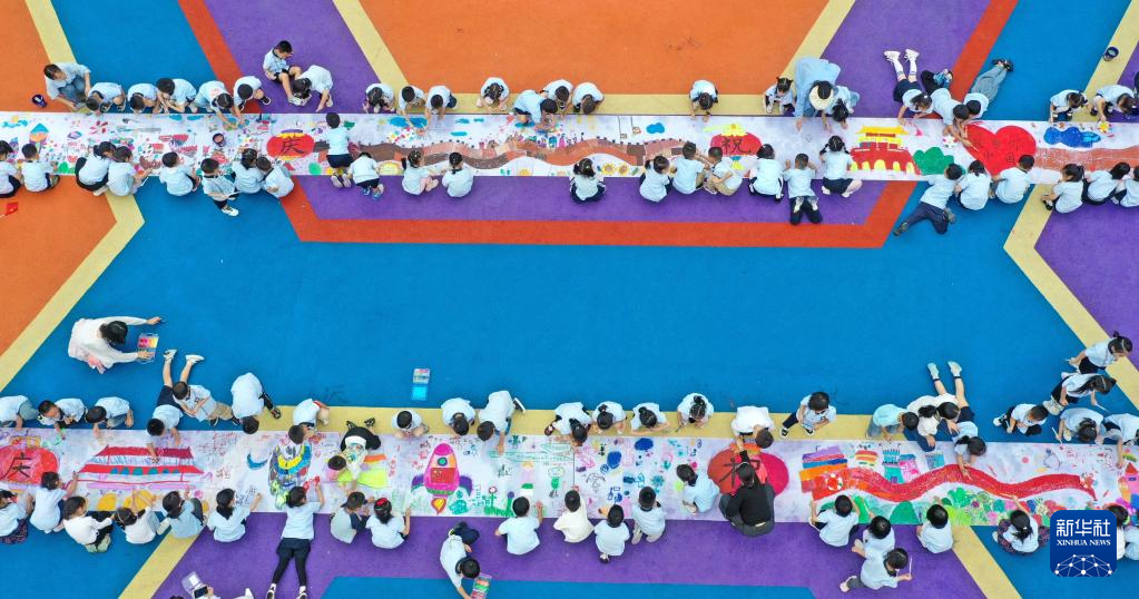 9月25日,浙江省台州市仙居县中心幼儿园的孩子们在“绘长卷迎国庆”活动中绘画(无人机照片)。