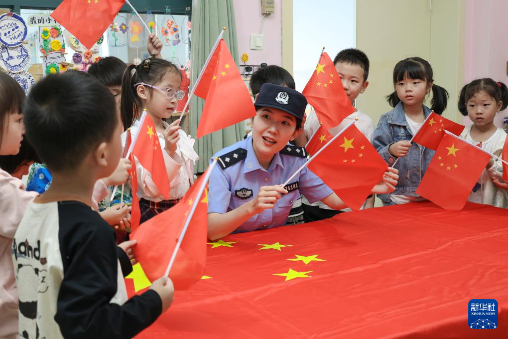 9月25日,浙江省台州市三门县公安局珠岙派出所民警在镇中心幼儿园给小朋友讲国旗知识。