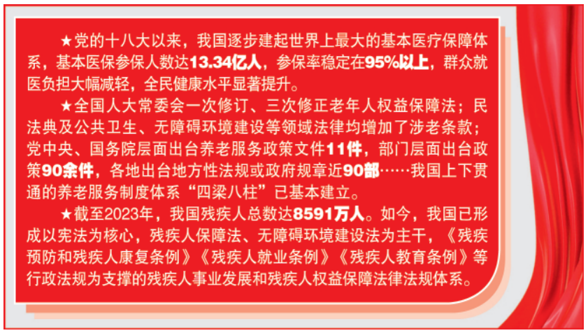 民生是人民幸福之基、社会和谐之本。增进民生福祉是党坚持立党为公、执政为民的本质要求。党的十八大以来,各部门各地区统筹推进经济发展和民生保障,在医疗、养老、残疾人权益保障等领域持续发力,不断完善法律制度建设,着力推出一系列惠民生、暖民心的举措,用法治保障人民权益增进民生福祉。在病有所医、老有所养、残有所助等方面不断取得新进展,为人民生活安康托底,徐徐铺展出一幅美丽的民生画卷...