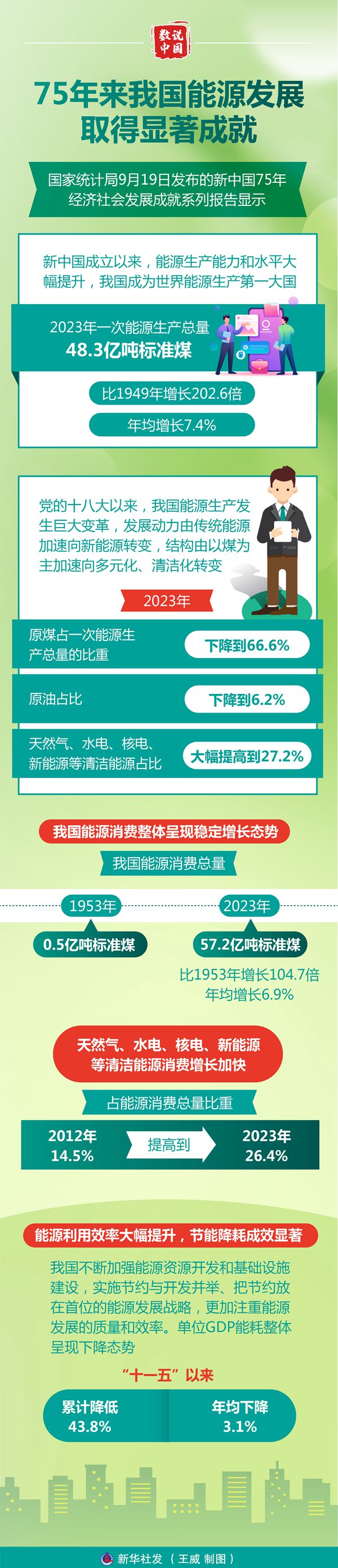 新华社北京9月19日电(记者唐诗凝、潘洁)国家统计局19日发布的新中国75年经济社会发展成就系列报告显示,75年来,我国能源发展取得显著成就,供应保障能力持续增强,绿色低碳转型深入推进,能源利用效率不断提升,节能降耗成效明显。