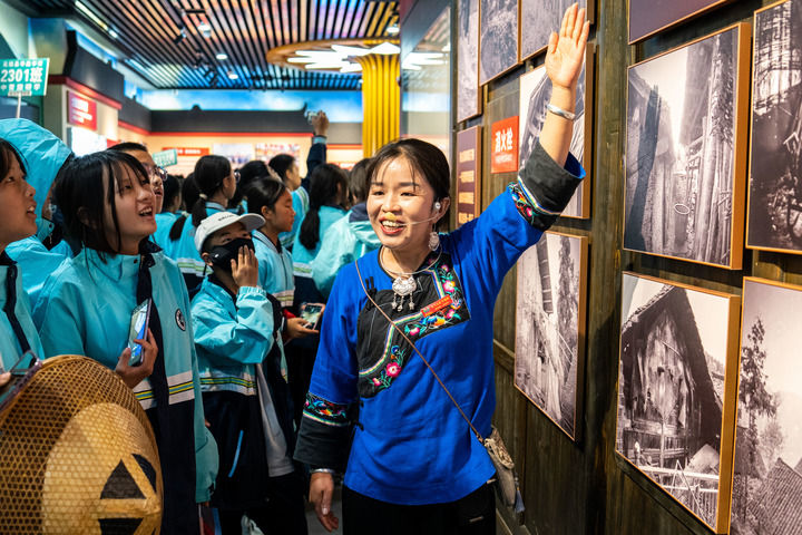 在湖南湘西十八洞村,讲解员施艳琴为游客讲解十八洞村的故事(2023年11月1日摄)。新华社记者 陈思汗 摄