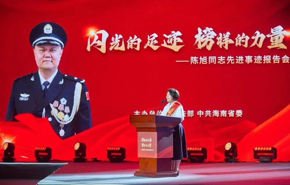 日前,陈旭妻子孙官梅在“陈旭同志先进事迹报告会”上进行宣讲。(海南省府城强制隔离戒毒所 供图)