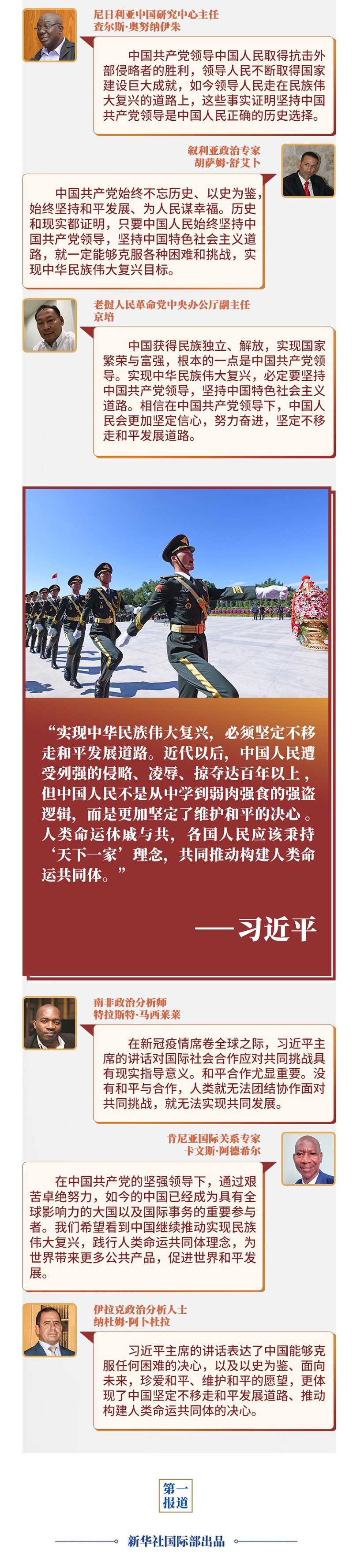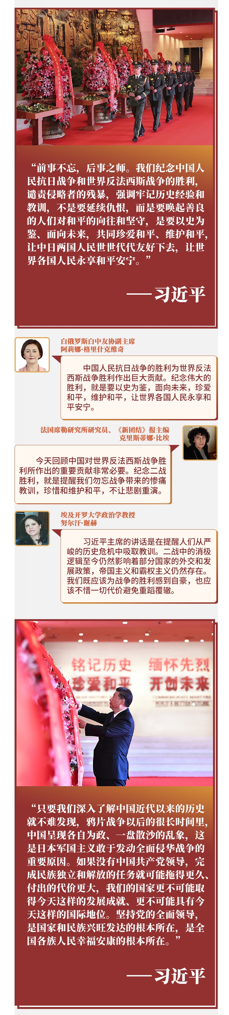 习近平在讲话中全面回顾中国人民抗日战争的伟大胜利,深入总结中国人民抗日战争胜利的历史启示,明确宣示中国走和平发展道路、维护世界和平、推动构建人类命运共同体的坚定决心,向世界传递丰富信息——