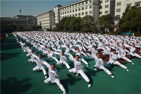 浙江省拱宸强制隔离戒毒所正在组织戒毒人员开展团体太极拳康复训练成果展示活动
