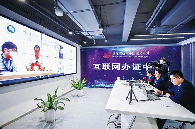 图为2022年1月21日,迪拜中国签证申请服务中心与浙江省杭州市国立公证处合作办理放弃继承声明的海外远程视频公证。司法部供图