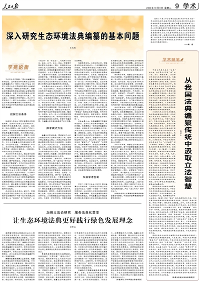 党的二十届三中全会审议通过的《中共中央关于进一步全面深化改革、推进中国式现代化的决定》对深化生态文明体制改革作出战略部署,提出“编纂生态环境法典”这一重大任务。编纂生态环境法典有利于推进生态文明法治建设,必将为建设美丽中国提供坚强法治保障。要深化对生态环境法典编纂相关问题的研究,以高水平研究成果助力高质量法典化立法,为完善中国特色社会主义法治体系贡献智慧和力量。编纂生态环境法典需要研究哪些基本问题?如何传承中华优秀传统法律文化蕴含的法治思想和智慧经验?怎样充分贯彻体现生态文明理念?本期学术版围绕这些问题进行探讨。